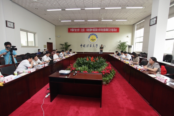 调研工作汇报会在中国矿业大学(北京)1号办公楼第一会议室举行。中国矿业大学(北京)党委书记杨仁树出席会议并讲话,副校长王忠强主持会议,科技园总经理孟国营、深部岩土力学与地下工程国家重点实验室主任、力学与建筑工程学院院长何满潮、科技产业处处长张浩等参加了会议。