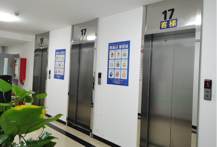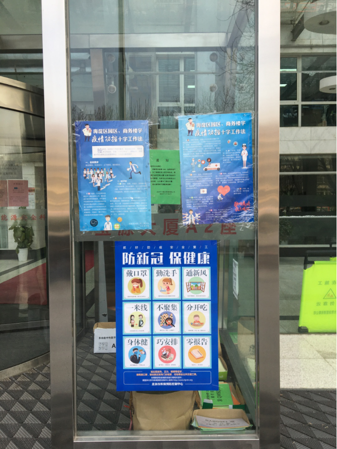 楼宇公共区域摆放提示牌、指引牌等宣传物料、海报传递疫情防控通知等相关知识