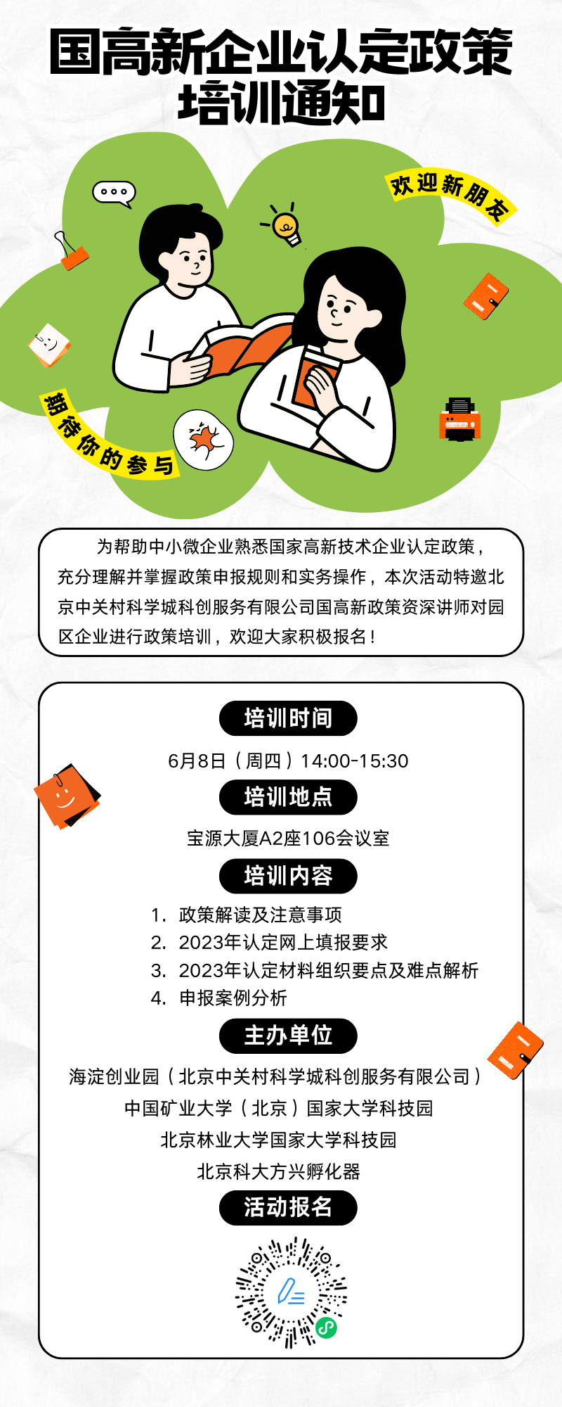 为帮助中小微企业熟悉国家高新技术企业认定政策,充分理解并掌握政策申报规则和实务操作,中国矿业大学(北京)国家大学科技园、北京林业大学国家大学科技园、北京科大方兴孵化器共同邀请北京中关村科学城科创服务有限公司国高新政策资深讲师,入园进行国家高新技术企业认定及申报培训,欢迎企业积极参加。活动具体安排如下: