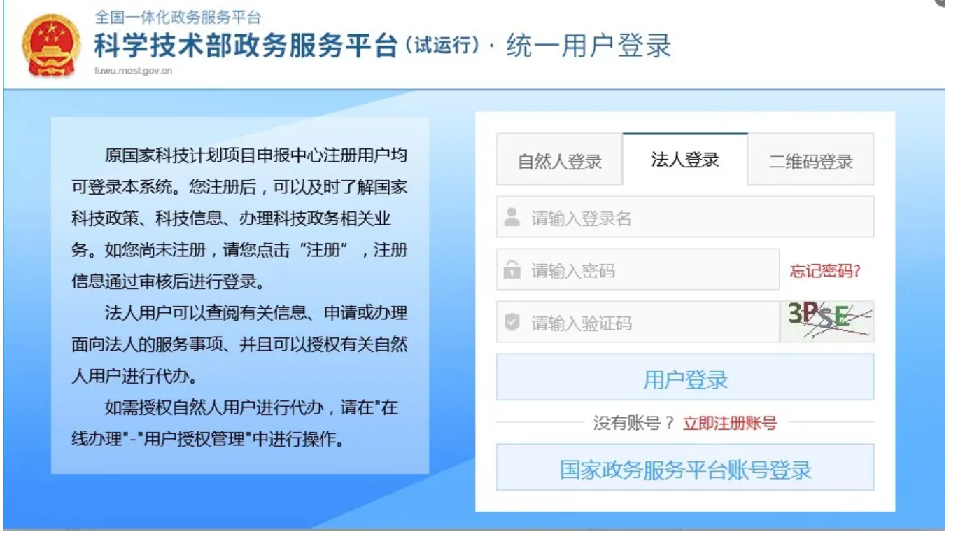 登录科学技术部政务服务平台(https://fuwu.most.gov.cn)系统注册。点击科学技术部政务服务平台首页右侧上方的“用户注册”进行注册,注册用户分为自然人用户和法人用户,采用实名制,各类用户须按相关要求统一注册备案,并确保备案信息真实性。(图1)。